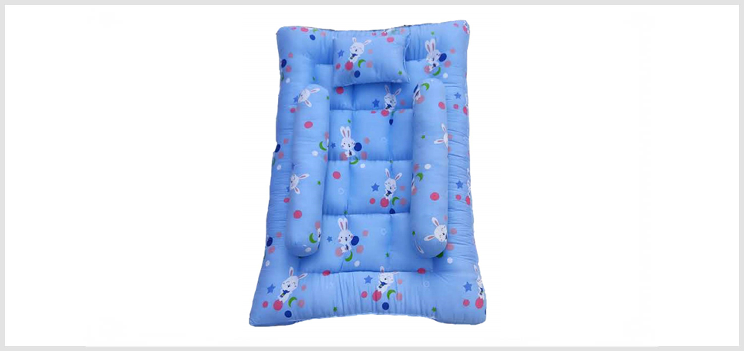 Baby F Double colour baby bed are made up of 100% cotton materials expect filling. Baby bed size:2.5x3 feet. Silk cotton filling:1.5 kg.